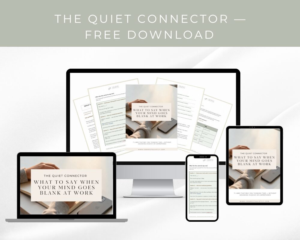 You are not struggling because you have nothing to say. You are struggling because high-stakes work moments reward fast, confident-sounding answers — and that format does not suit everyone. The Quiet Connector gives you practical tools to handle those moments more clearly, calmly, and credibly, using a method that works with how you actually think.